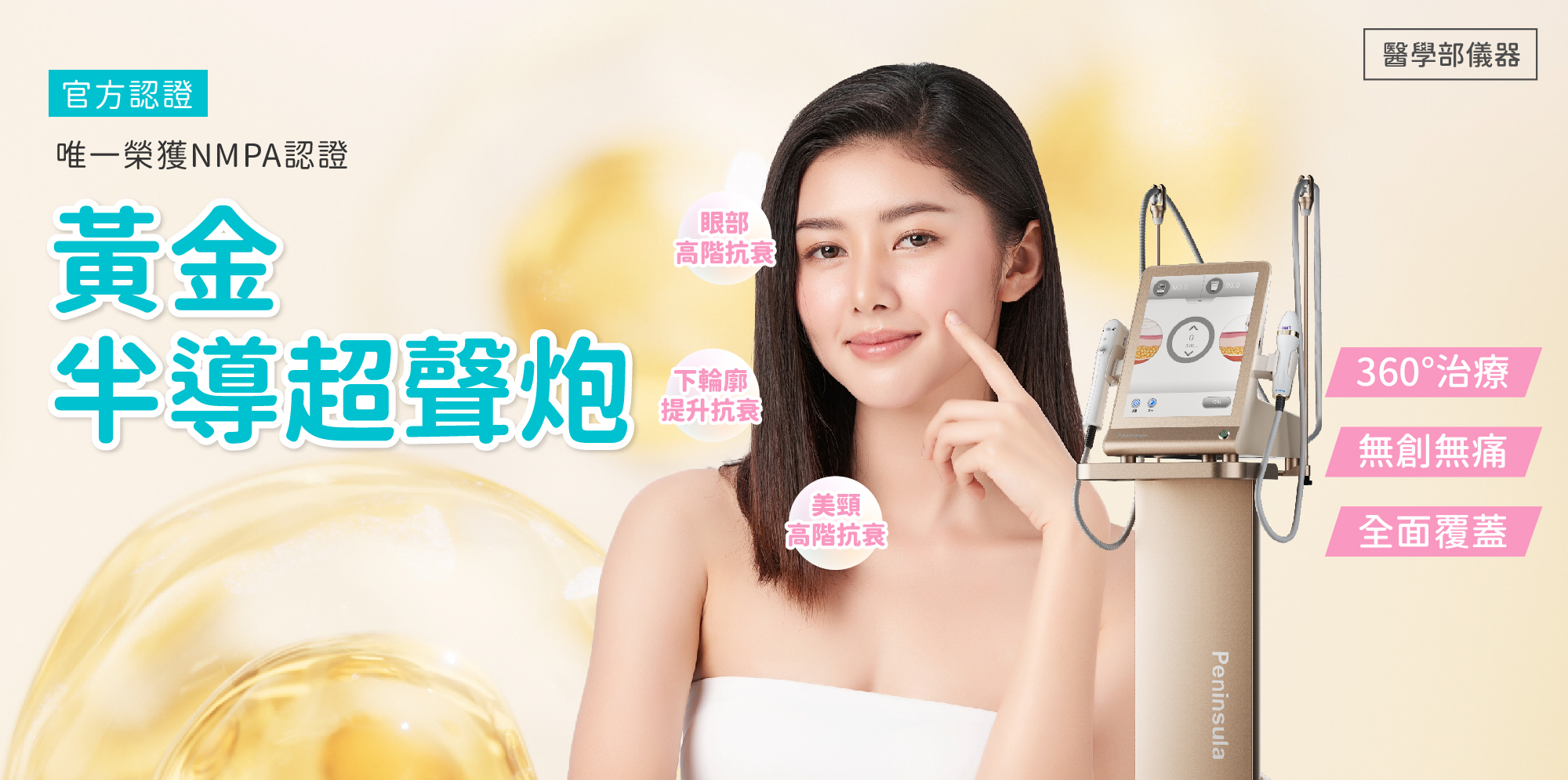 黃金半島超聲炮:是通過超聲波形式聚焦熱能,精准作用在皮膚的多個層次上,通過加熱來收緊筋膜層,促進筋膜複位、刺激膠原與彈力再生,改善皮膚鬆弛、皺紋等問題。