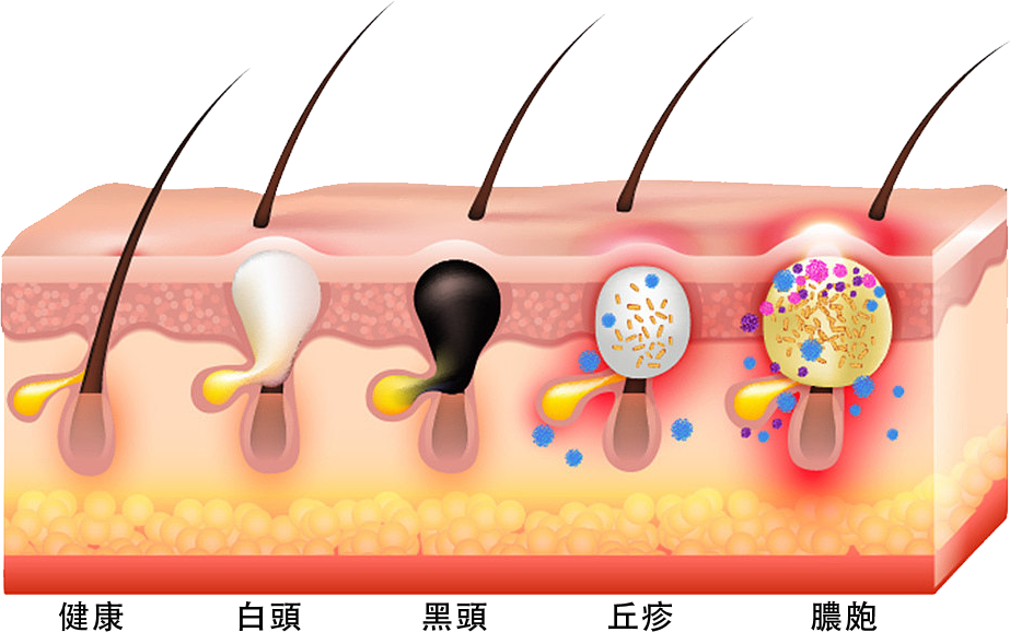 皮脂線分泌旺盛,油脂積聚在毛囊內不能排出,毛囊附近組織發炎,形成紅腫以至膿皰