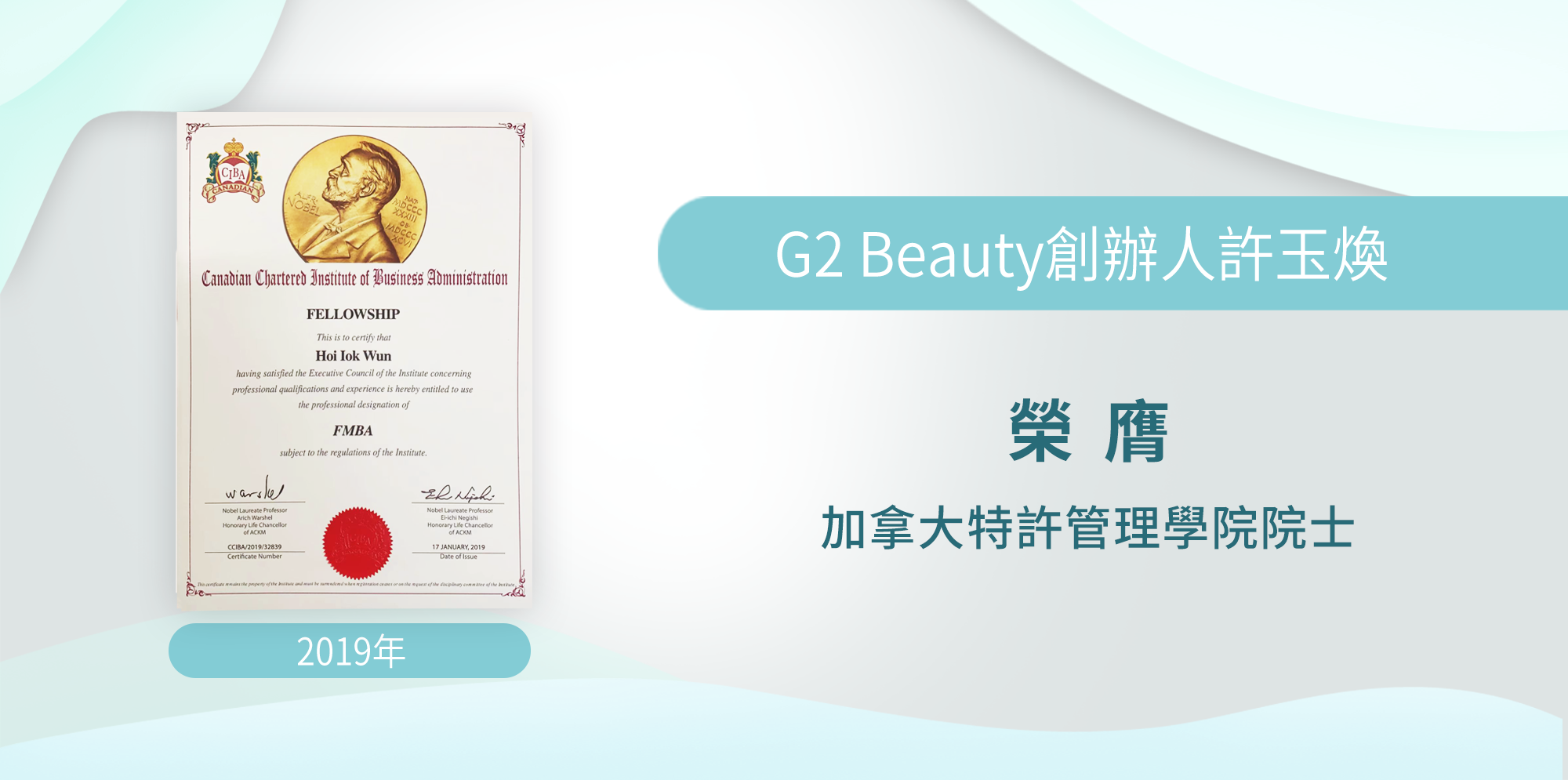 由加拿大特許管理學院主辦的「2019年度諾貝爾獎學人榮譽資格及獎項頒授典禮 」,2019年1月17日在香港亞洲國際博覽館完滿舉行。2014年諾貝爾物理學獎得主中村修二教授做為主禮嘉賓出席本次典禮。G2 Beauty Group 創始人许玉焕荣膺加拿大特许管理学院院士。
