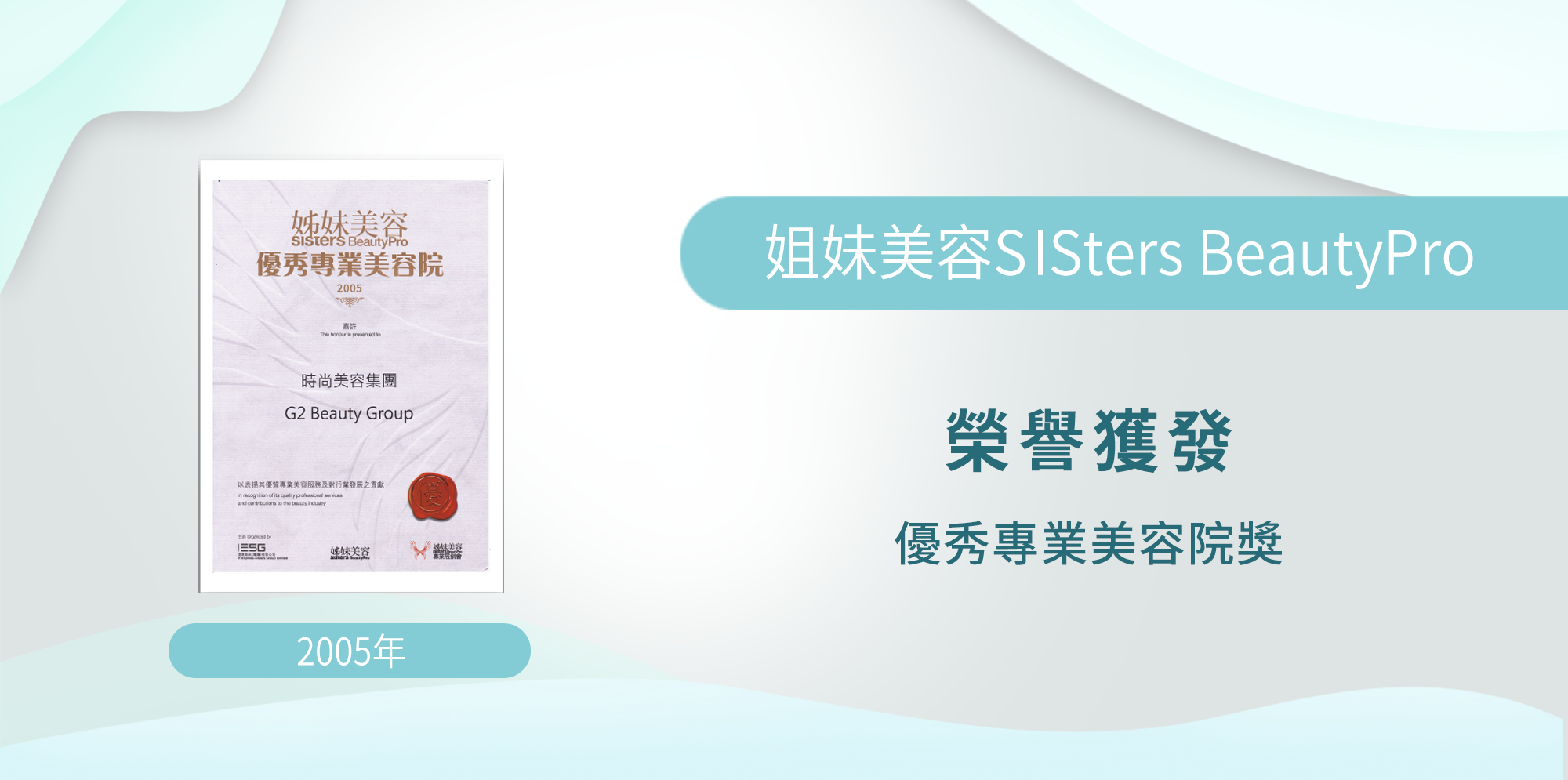 2005年,G2 Beauty Group時尚美容集團以高人氣與高口碑再次獲姐妹美容SiSters BeautyPro 頒發“2005年度「優秀專業美容院獎」”,為G2Beuay再添一筆精彩的註腳。