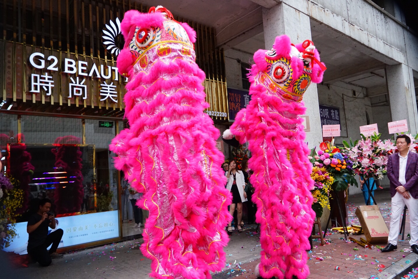 标准金——G2 Beauty金色招牌,醒目的让人一眼就看见,G2创始人许玉焕女士与亲友一同参与剪彩,舞狮献瑞,一连串高难度动作将气氛推向高潮。
