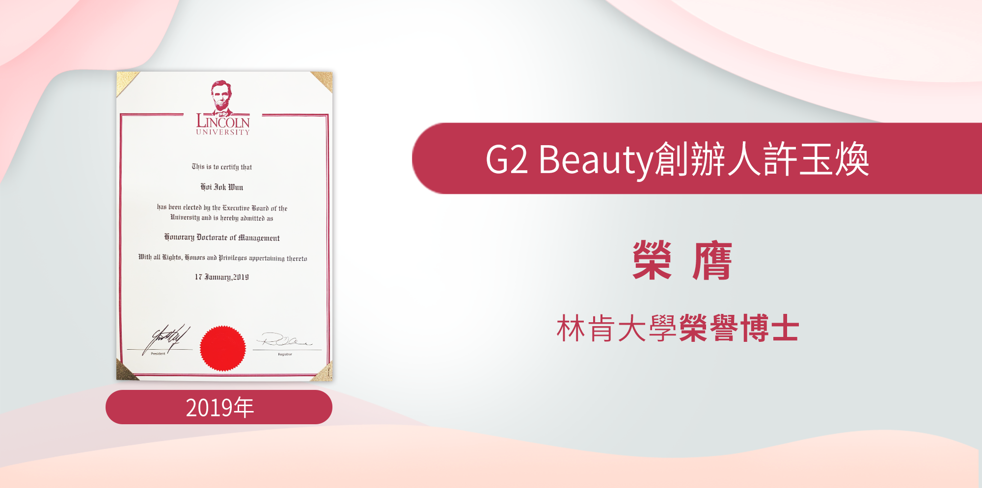 2019年1月17日G2Beauty创始人许玉焕,凭借在澳门美业的强大影响力登上国际舞台,荣膺林肯大学荣誉管理博士。