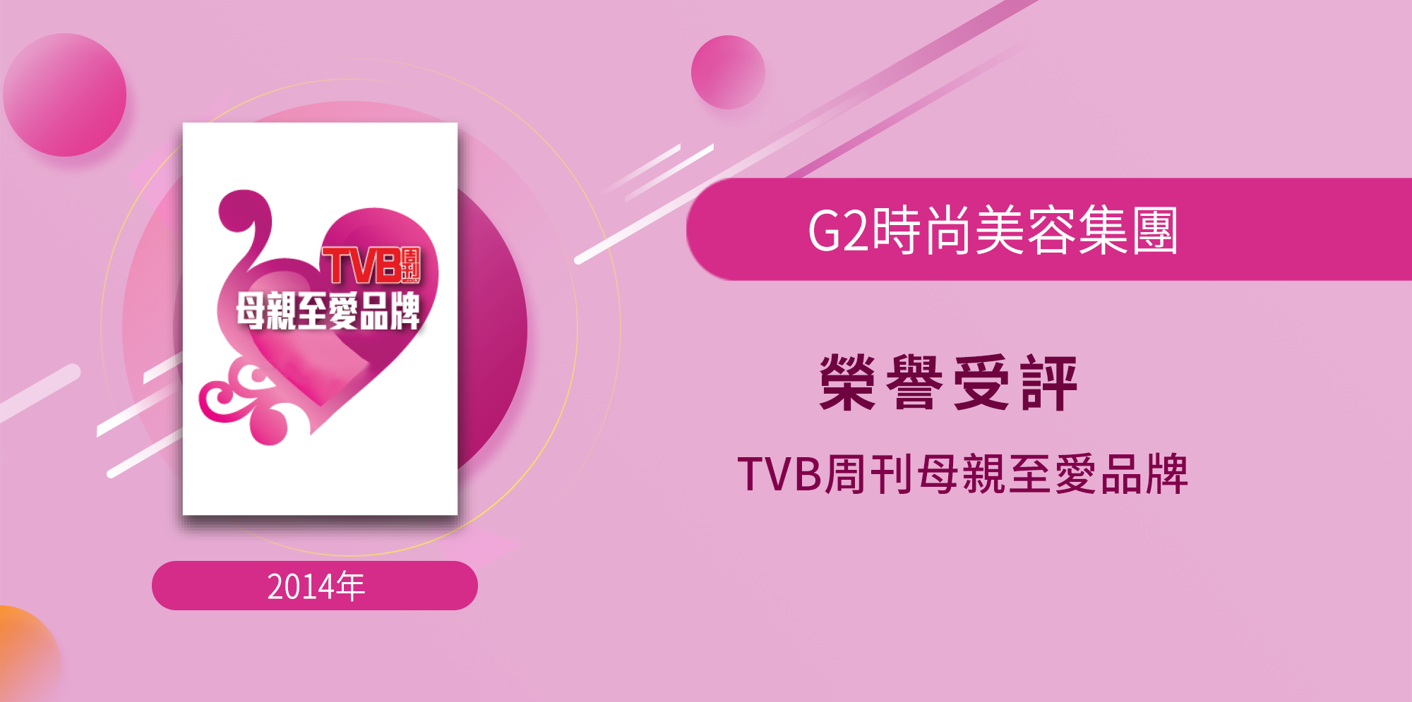 任何企业要长久生存,口碑不好将是致命的,事实上,用户选择美容企业时,大众口碑评论起到了决定性作用。因此,2014年度母亲至爱品牌是受众多商家格外青睐的一个高含金量奖项。 G2 Beauty 始终坚持提供优质服务,不放松、不懈怠,口碑效应不断累计与扩大,荣获TVB周刊颁发「母亲至爱品牌奖」。